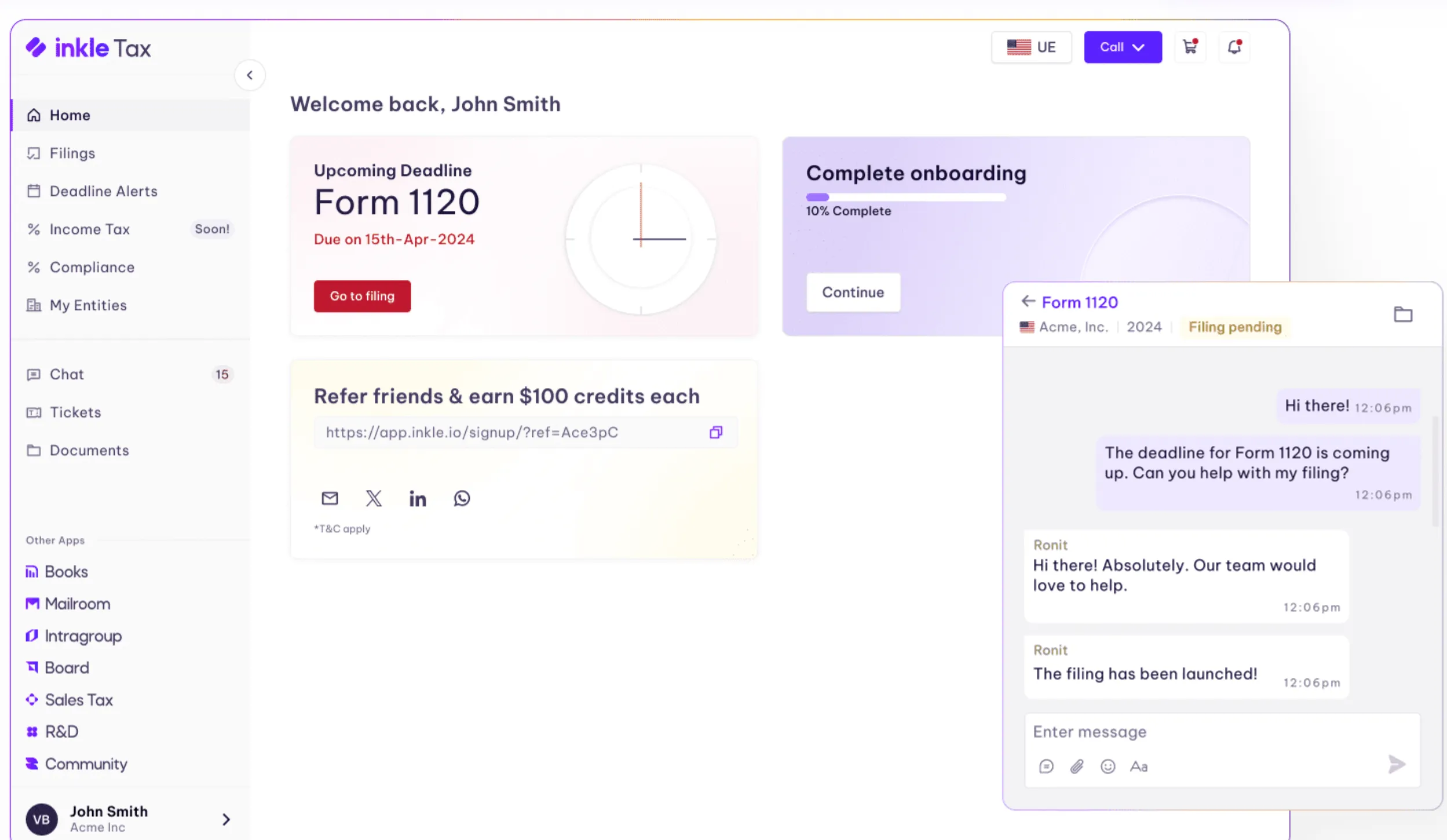 Inkle Tax offers a simplified tax calculation summary of US taxes, with CPAs available on chat support to answer your queries. The software keeps you on track with important dates, thanks to time-sensitive reminders on US State and federal taxes and compliance deadlines.