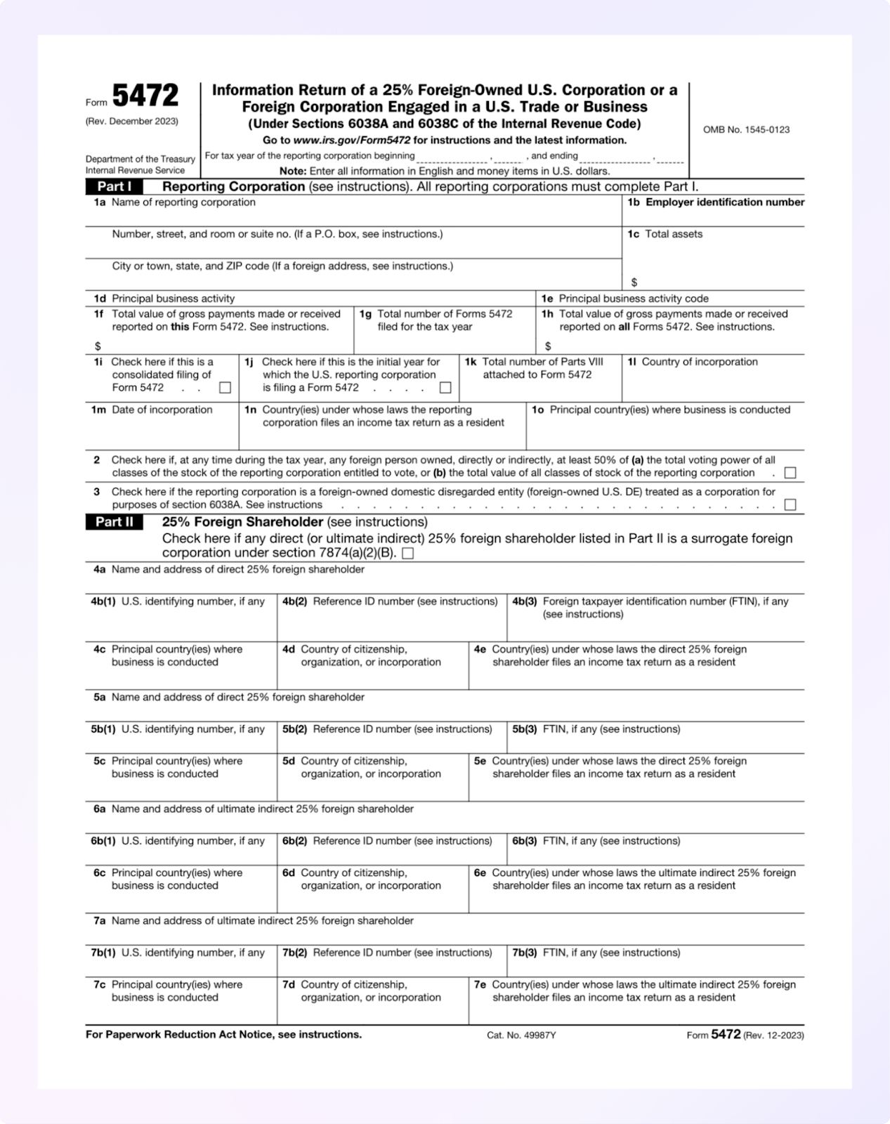 Form 5472 is an IRS information return used to report transactions between a US entity and its foreign-related parties. It applies to US corporations with significant foreign ownership and to disregarded entities (like single-member LLCs) owned by foreign persons.