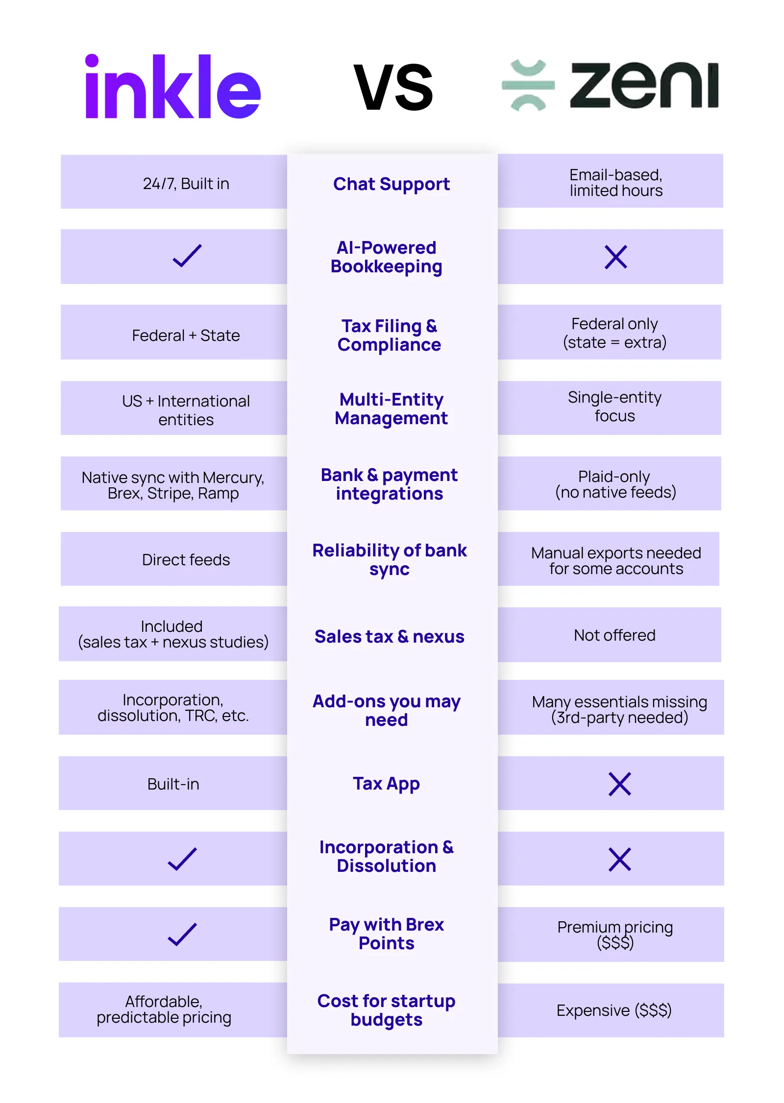 Zeni charges $549–$5,000+ for services that Inkle delivers at a fraction of the cost. You still get GAAP-ready books, IRS-compliant filings, and multi-entity support, but with transparent, predictable pricing that actually makes sense for early-stage teams.