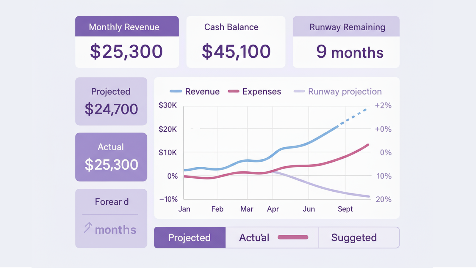 - Forecast cash flow based on current spend and sales pipeline, helping founders plan for shortfalls or surpluses in advance.