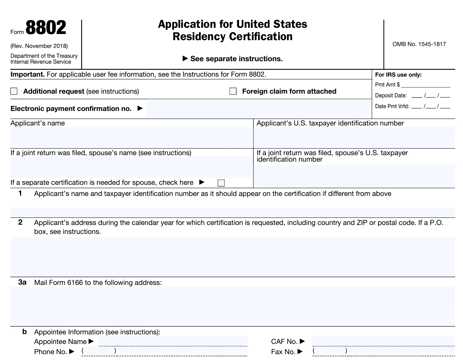 In short, IRS Form 8802 provides a pathway for individuals and companies to claim tax treaty benefits by proving their U.S. residency. By submitting this form and meeting the eligibility criteria, applicants can apply for a Tax Residency Certificate, which allows for reduced taxation rates on specific types of income.