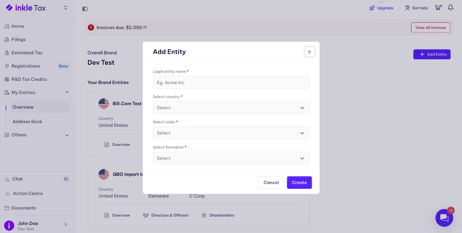 Adding your entities helps Inkle Tax centralise all domestic and foreign records in one place. This step keeps your compliance, filings, and bookkeeping tied to the right entity, and gives you a single dashboard to manage everything.