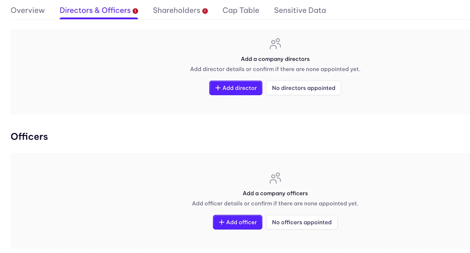 The Directors & Officers tab lets you record the individuals responsible for managing and governing your entity. Keeping this section complete ensures accurate compliance filings, annual reports, and state-level obligations.
